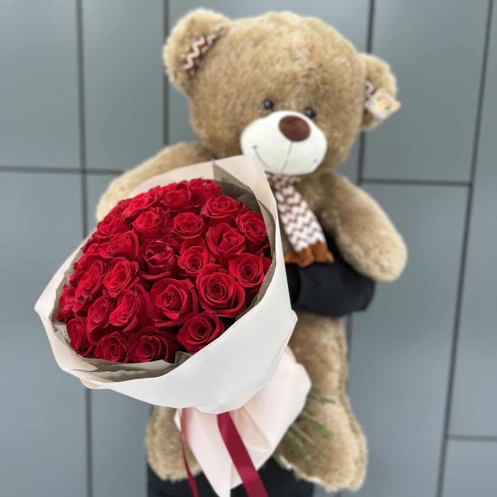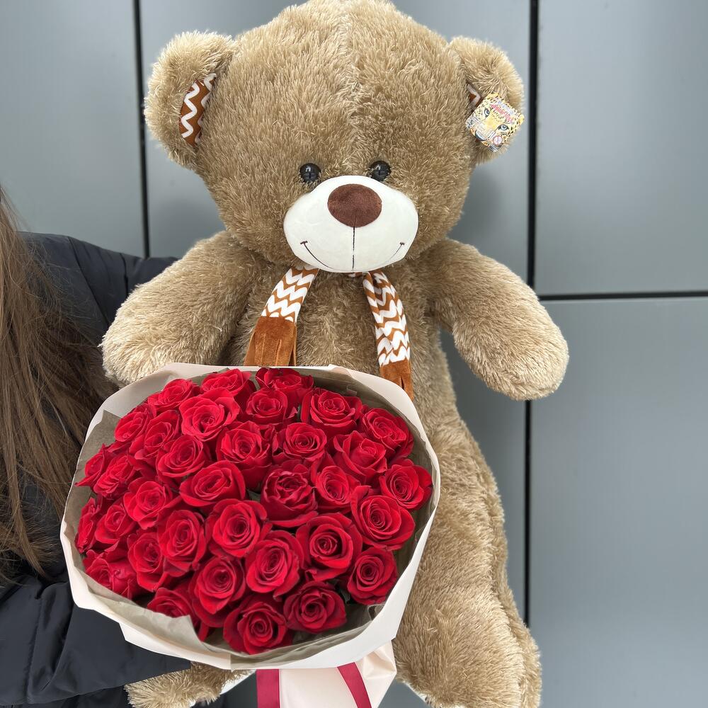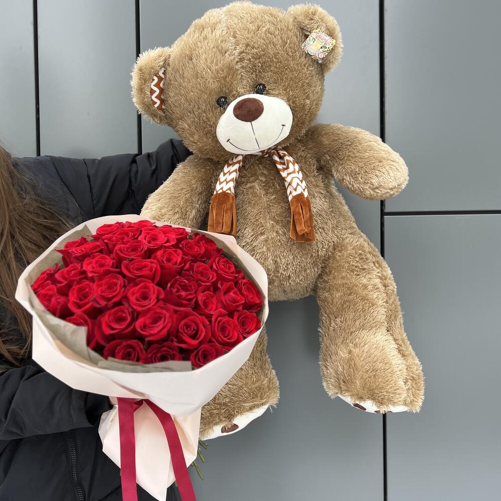 Комбо 1 из 35 красных роз и мягкой игрушки медведя
