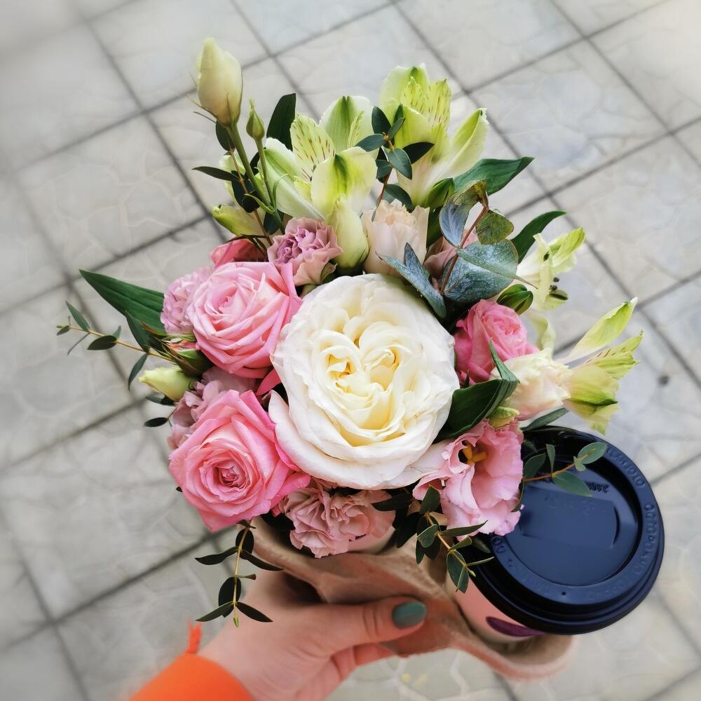 Альстромерия – 2 шт. Роза одноголовая – 1 шт. Роза кустовая пионовидная – 1 шт. зелень декоративная – 2 шт. Капучино – 1 шт.