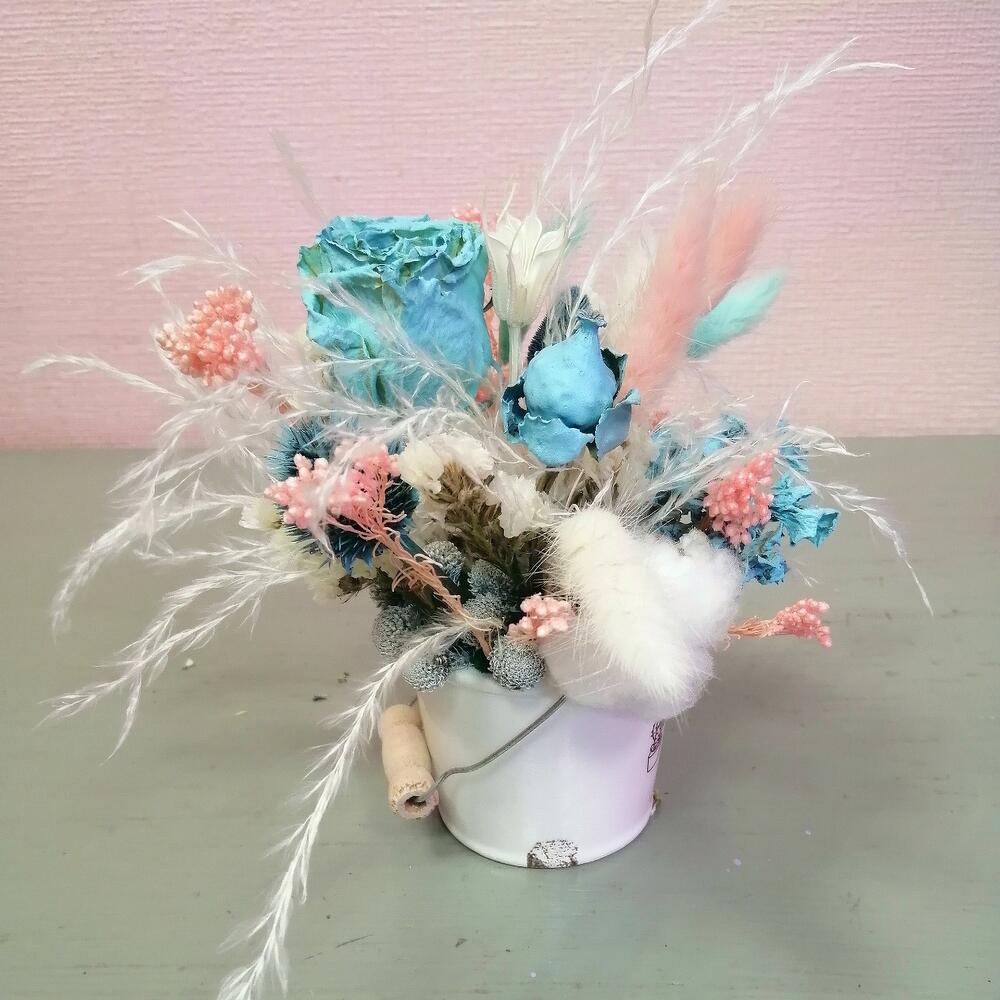 Роза сухоцвет – 1 шт.эхинацея сухоцвет – 2 шт.Озотамнус розовый – 1 шт.Хлопок натуральный – 1 шт.Лагурус (сухоцвет) – 6 шт.статица сухоцвет – 1 шт.Ковыль – 1 шт.кашпо ведерко – 1 шт.Оазис флористический – 1 шт.