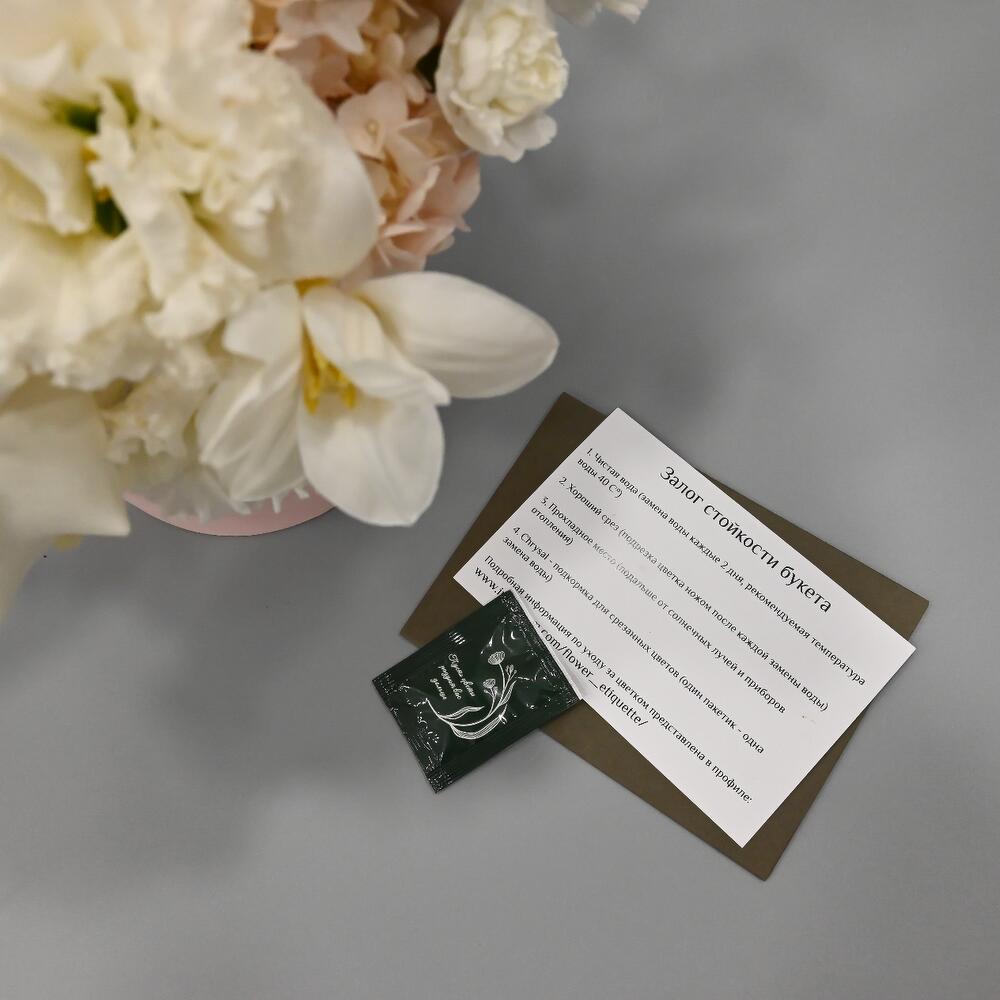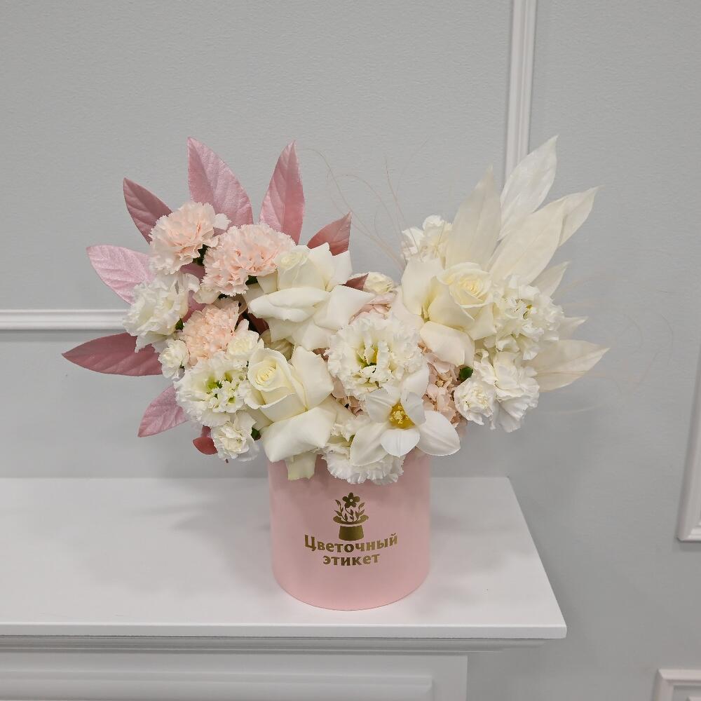 Тюльпан – 1 шт.Пионовидная роза – 3 шт.Гвоздика – 7 шт.Лизиантус Алиса белый – 2 шт.Гортензия розовая – 1 шт.Аралия – 1 шт.Рускус – 3 шт.Ковыль – 3 шт.Роза кустовая – 2 шт.Шляпная коробка – 1 шт.Гвоздика кустовая – 2 шт.коккулус – 1 шт.