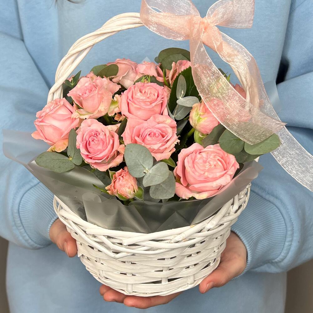 Роза кустовая пионовидная – 4 шт.Корзина плетеная – 1 шт.комплимент от polyanka – 1 шт.