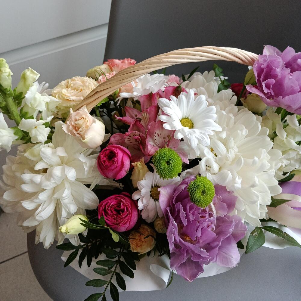 Хризантема Антонов – 3 шт.Роза кустовая – 4 шт.Эустома – 1 шт.Писташ – 2 шт.Альстромерия – 1 шт.Хризантема кустовая – 2 шт.Тюльпан – 2 шт.антиринум – 1 шт.Оазис флористический – 2 шт.Корзина плетеная – 1 шт.Декор – 1 шт.