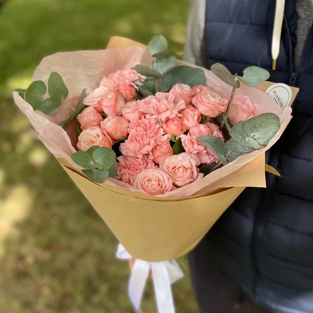 кустовая роза madam bombastic – 5 шт.Диантус розовый – 5 шт.Эвкалипт – 3 шт.Фирменная упаковка – 1 шт.