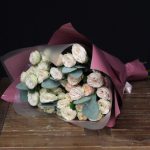 трендсеттер роза кустовая – 7 шт.Эвкалипт – 3 шт.Пленка матовая – 5 шт.Лента атласная – 1 шт.