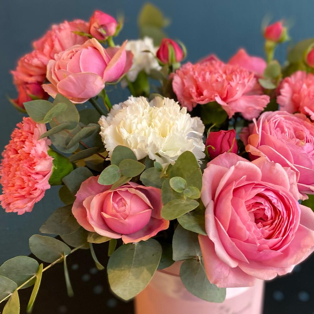 Эвкалипт – 1 шт.Диантус – 6 шт.Коробка шляпная – 1 шт.Роза пионовидная кустовая – 2 шт.Оазис флористический – 1 шт.