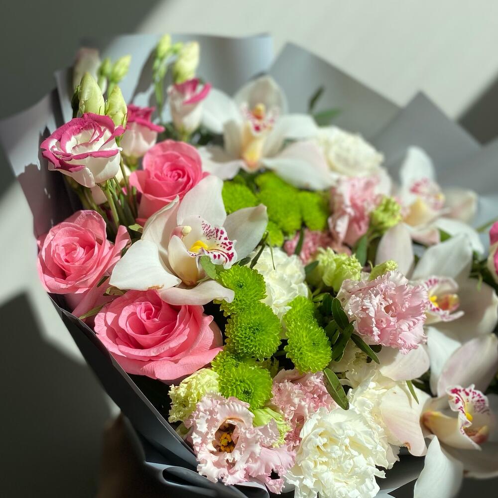 Лизиантус – 5 шт.Орхидея Цимбидиум – 5 шт.Роза – 3 шт.Упаковка – 5 шт.Фисташка – 8 шт.Гвоздика сортовая – 5 шт.Сантини зеленая – 4 шт.