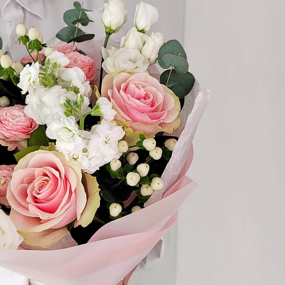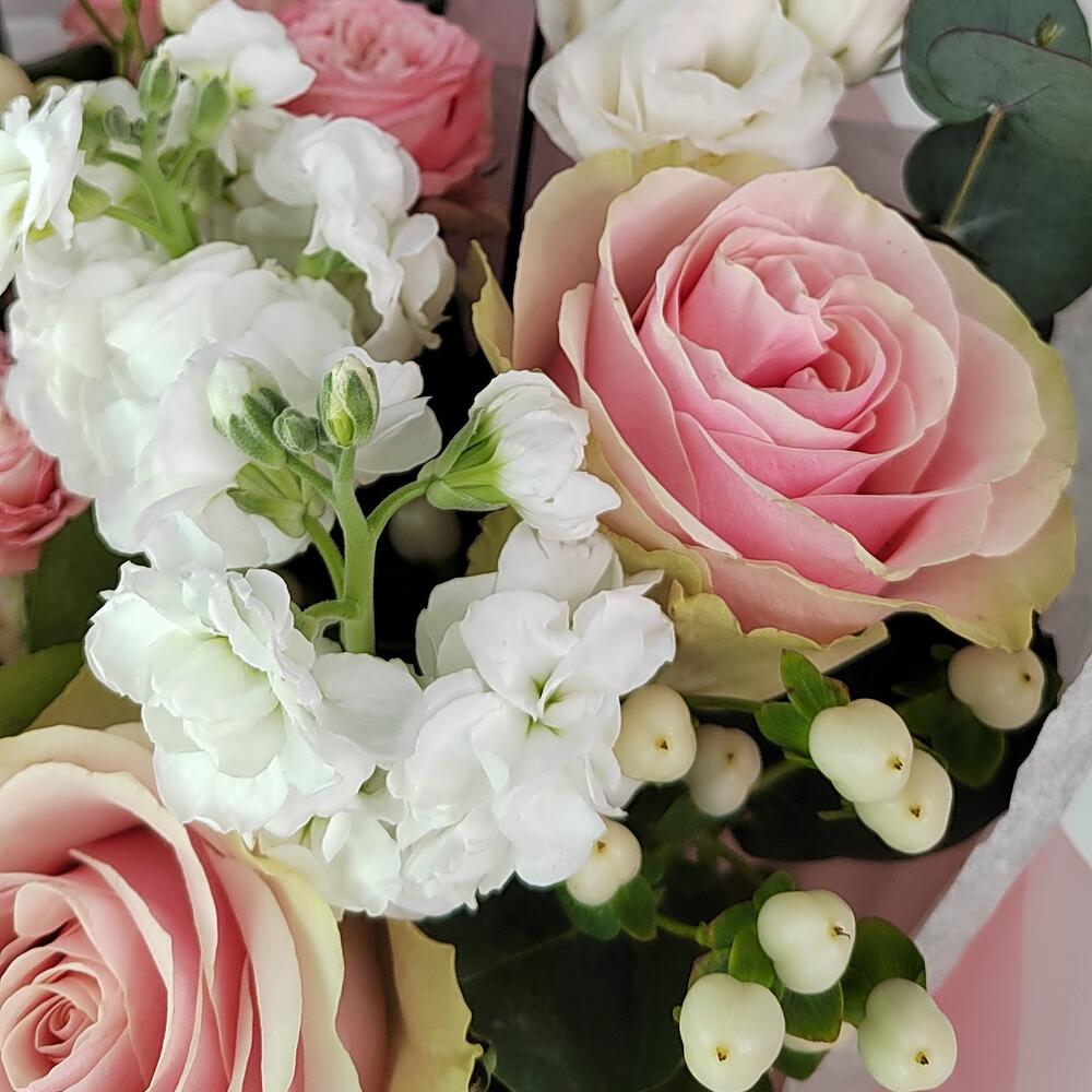 Нежный букет с розовой розой, белой эустомой и ягодами