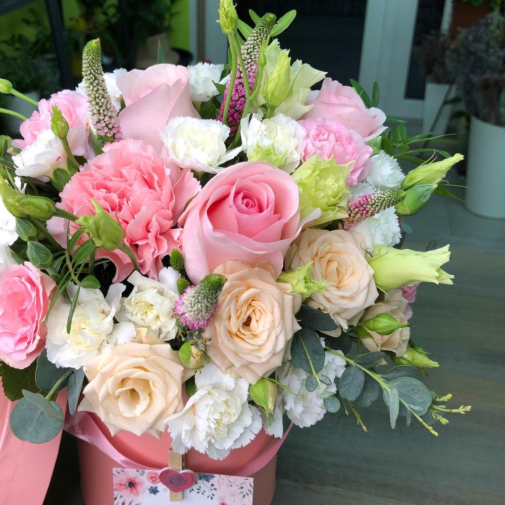 Лизиантус – 2 шт.Роза кустовая – 2 шт.Роза – 3 шт.Шляпная коробка с лентами – 1 шт.Оазис флористический – 1 шт.зелень декоративная – 3 шт.зелень микс – 5 шт.диантус микс – 6 шт.