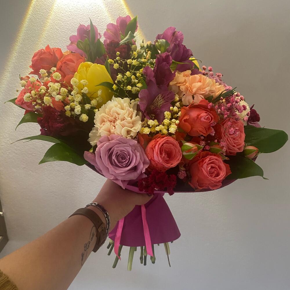 Гвоздики, Лизиантусы, Розы, Тюльпаны