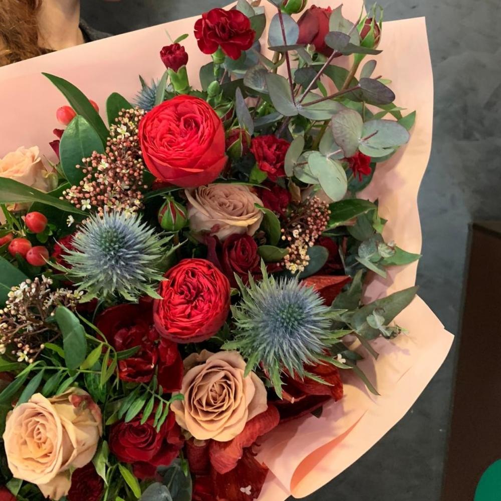 Роза – 7 шт.Роза кустовая – 5 шт.Протея – 1 шт.Гиперикум – 5 шт.Скиммия – 5 шт.Эрингиум – 4 шт.Эвкалипт – 5 шт.Лента атласная – 3 шт.Упаковка дизайнерская – 5 шт.