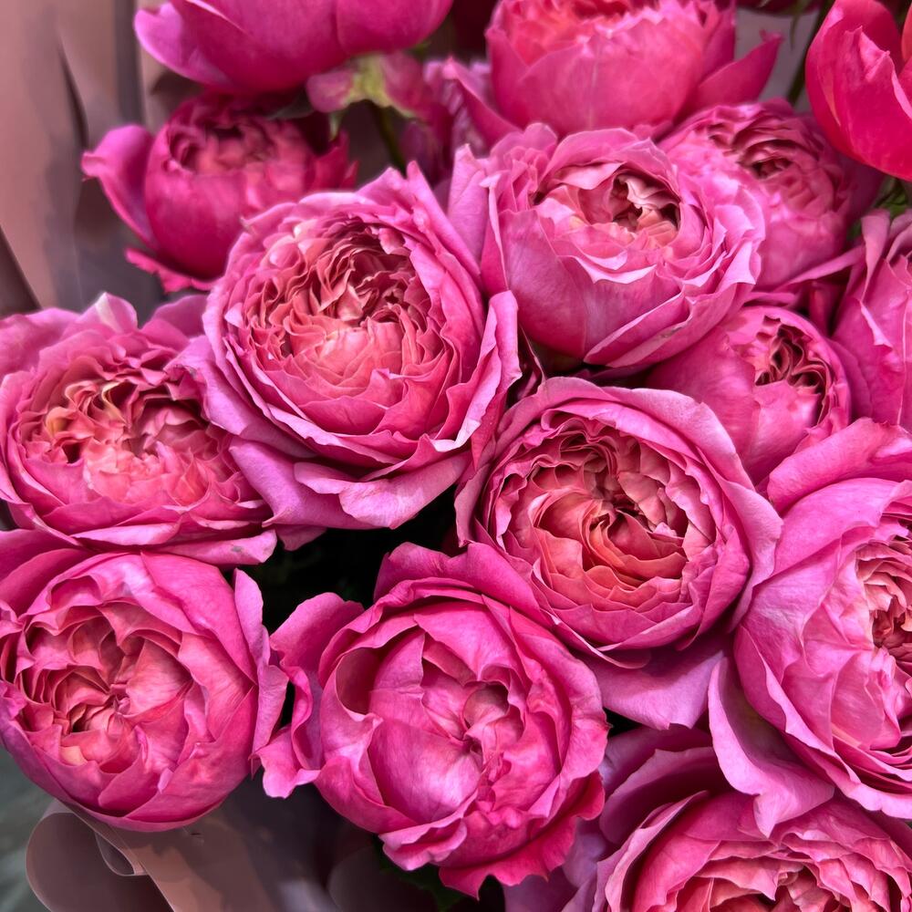 Зелень – 10 шт. Лента атласная – 1 шт. Роза пионовидная кустовая – 9 шт. Упаковка дизайнерская – 8 шт.