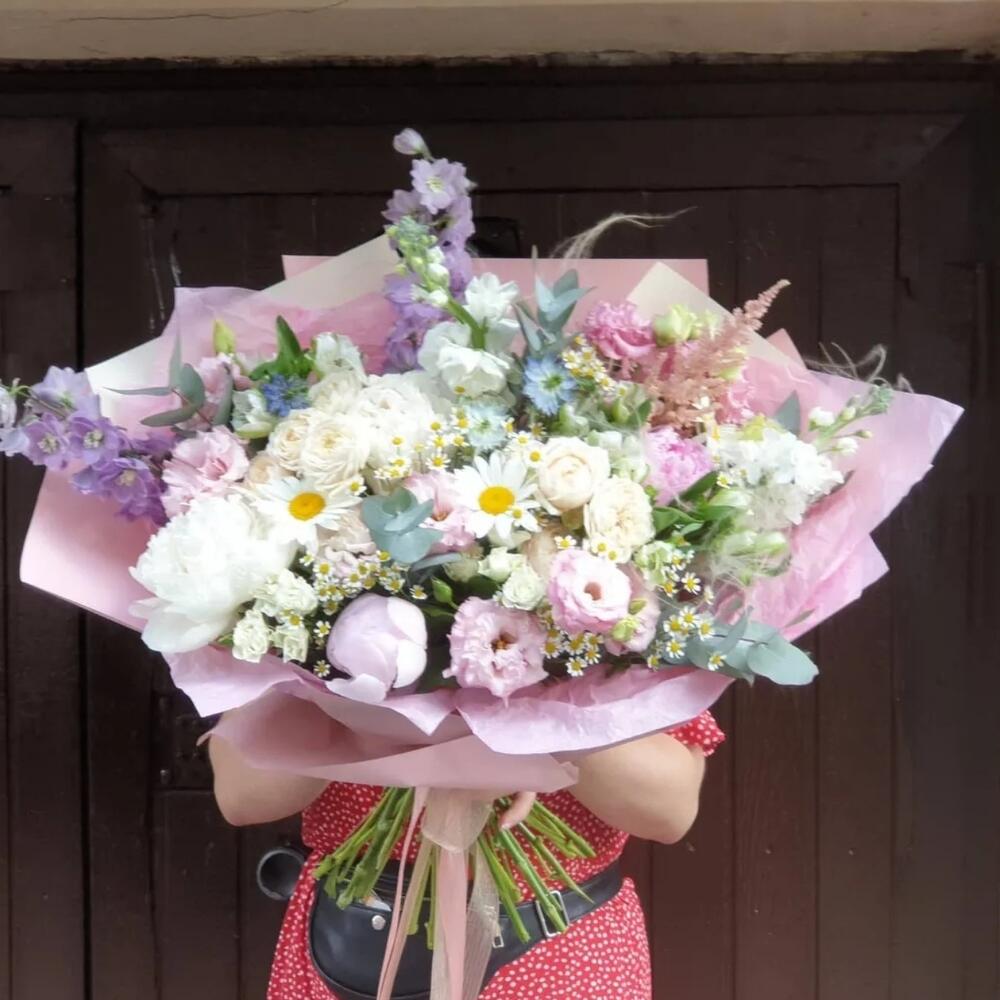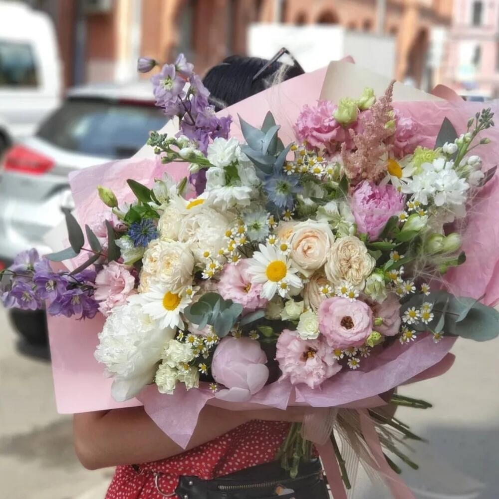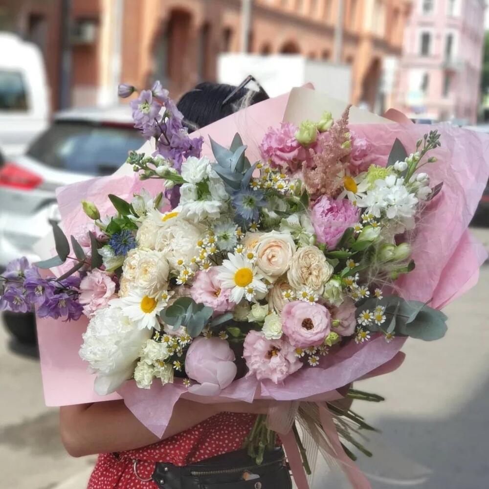 Пион – 4 шт.Дельфиниум – 2 шт.Маттиола – 2 шт.Лизиантус алиса пинк – 3 шт.Альстромерия – 3 шт.Роза пионовидная кустовая – 2 шт.Роза кустовая – 2 шт.Ромашка – 4 шт.Ромашка кустовая камилла – 4 шт.Эвкалипт – 5 шт.Астильба Европа – 1 шт.васильки – 3 шт.Сухоцветы – 3 шт.Упаковка дизайнерская – 1 шт.Лента атласная – 2 шт.