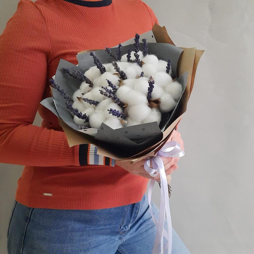 «Лавандовое созвездие» Букет из розы, гвоздики, статица и хлопка