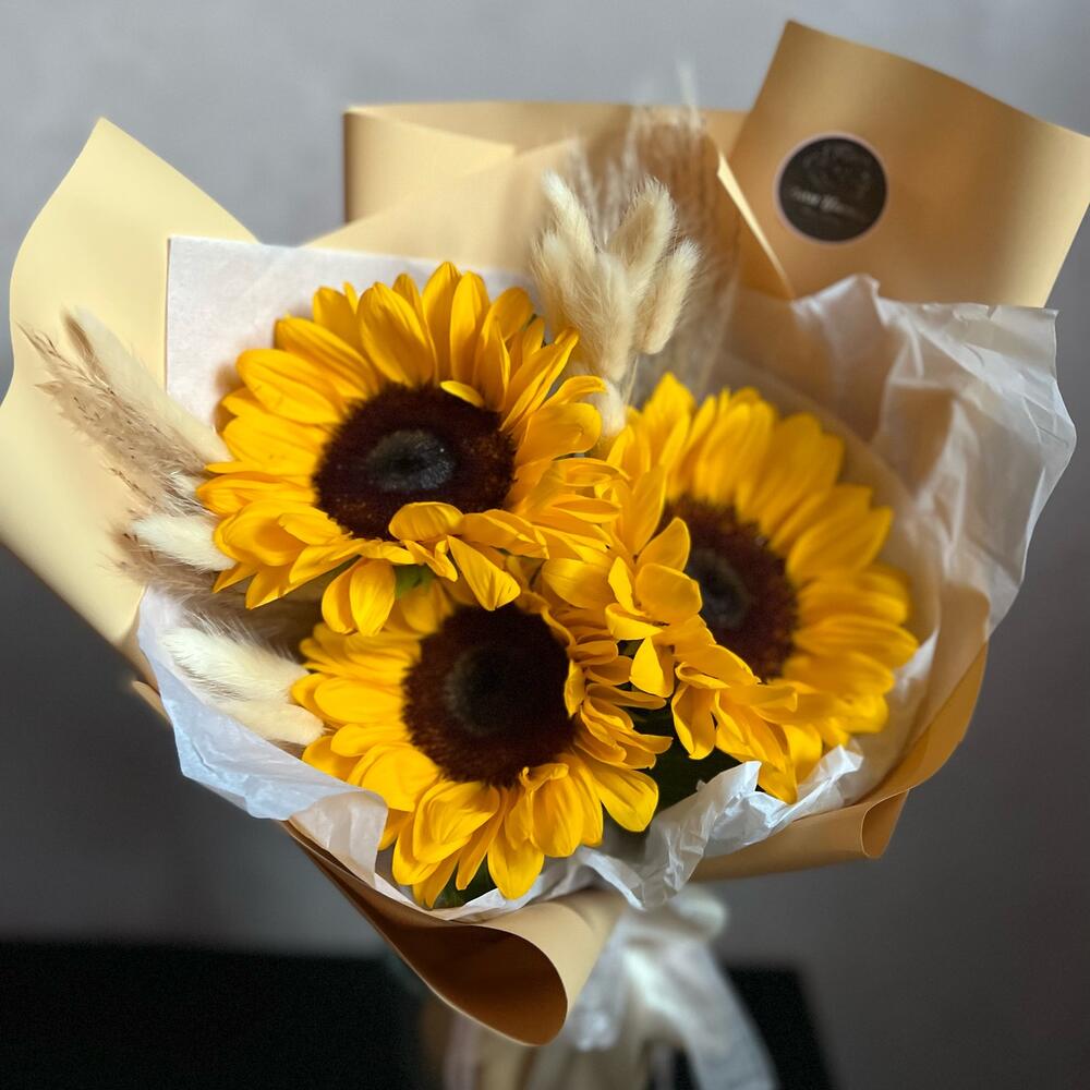 Подсолнух – 3 шт.сухоцветы пучок – 2 шт.декоративная упаковка – 1 шт.Атласная лента – 1 шт.