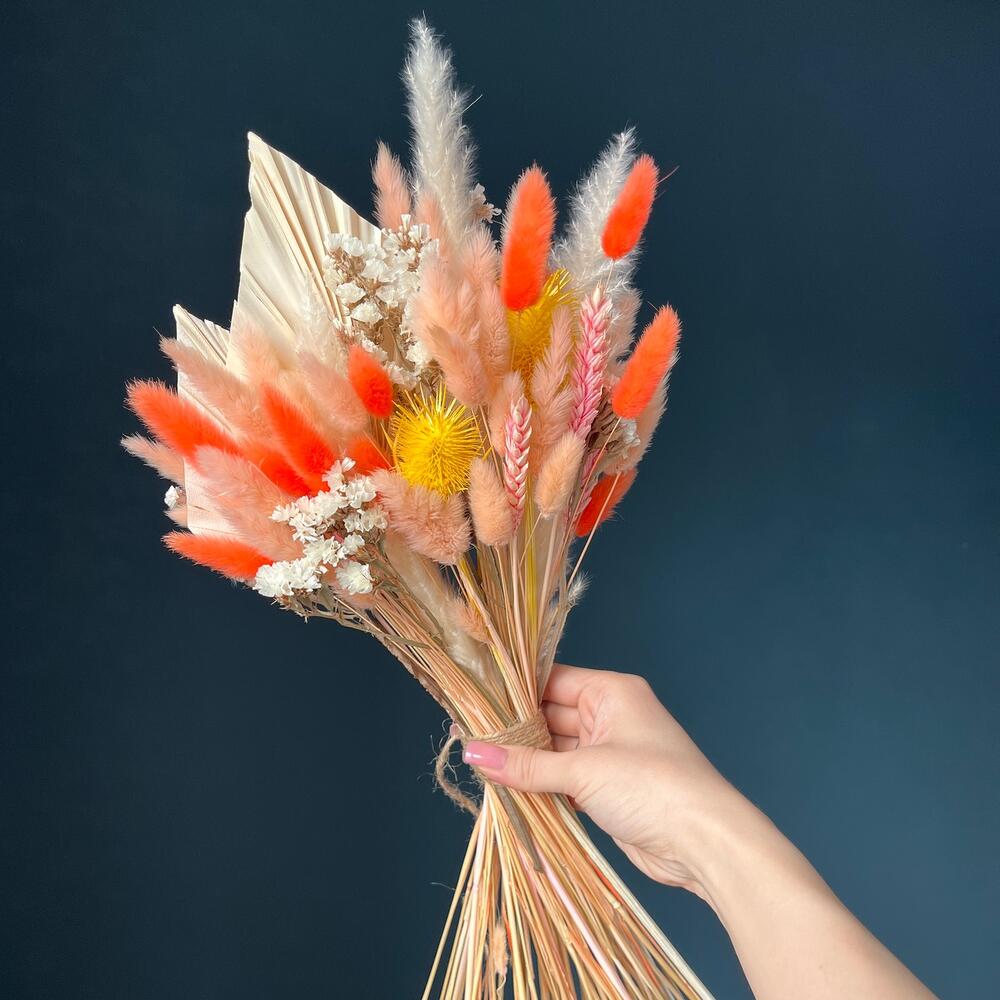 Лагурус (сухоцвет) – 80 шт.ворсянка сухоцвет – 4 шт.статица стабилизированная – 5 шт.пальма сухоцвет – 2 шт.Колосья пшеницы – 10 шт.пампас мини – 3 шт.