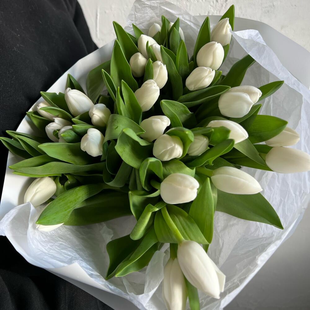 Лента атласная – 3 шт.Упаковка дизайнерская – 5 шт.Белый тюльпан – 29 шт.
