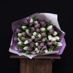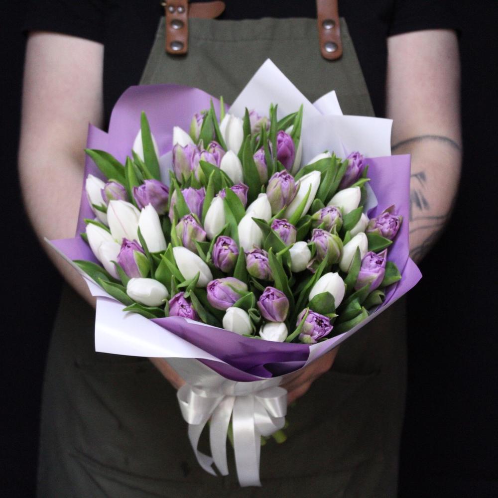 Тюльпан пионовидный дабл прайс – 25 шт.Тюльпан белый – 26 шт.Пленка дизайнерская – 2 шт.Лента атласная – 1 шт.