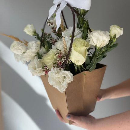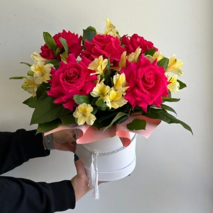 Хризантемы и Пионовидные кустовые розы в коробке + открытка ручной работы в подарок